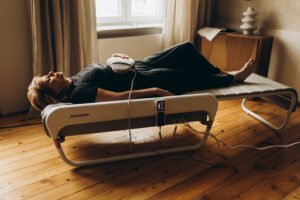 Terapia térmica intensiva hasta 65 °C. Todo el cuerpo se calienta mediante un masaje térmico intensivo de hasta 65 °C a lo largo de la columna vertebral, mientras que elementos calefactores adicionales en la unidad principal y en la esterilla bajo el colchón proporcionan calor suplementario.